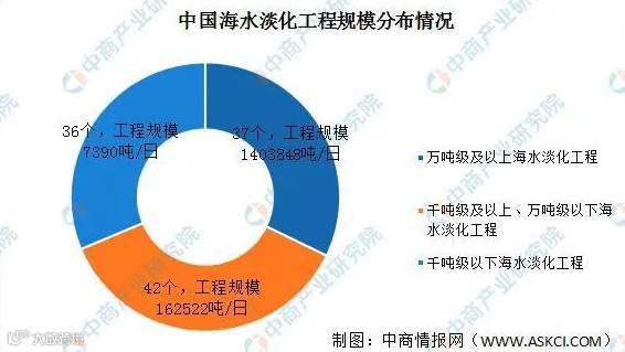 截至2019年底,全国现有海水淡化工程115个,其中,万吨级及以上海水淡化工程37个,工程规模1403848吨/日;千吨级及以上、万吨级以下海水淡化工程42个,工程规模162522吨/日;千吨级以下海水淡化工程36个,工程规模7390吨/日。2019年全国新建成海水淡化工程最大规模为180000吨/日。