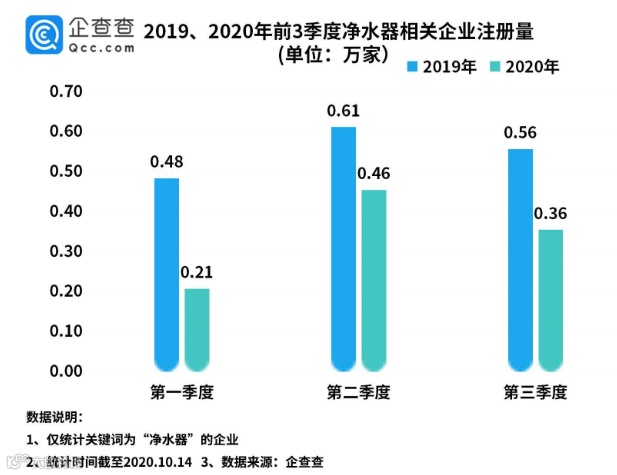 企查查数据显示,2020年前三季度共新增10000余家净水器相关企业,同比降38.5%。其中第一季度受疫情等因素影响,注册量仅2000余家,同比下降57%。第二季度回升至4600余家,环比增长119%,同比下降25.6%。第三季度注册量有所回落,达到3600余家。尤其对这个尚未完成“产品普及和消费升级”的产业,最大的挑战莫过于与不确定性共处的同时,不断进化找到新的增长空间。