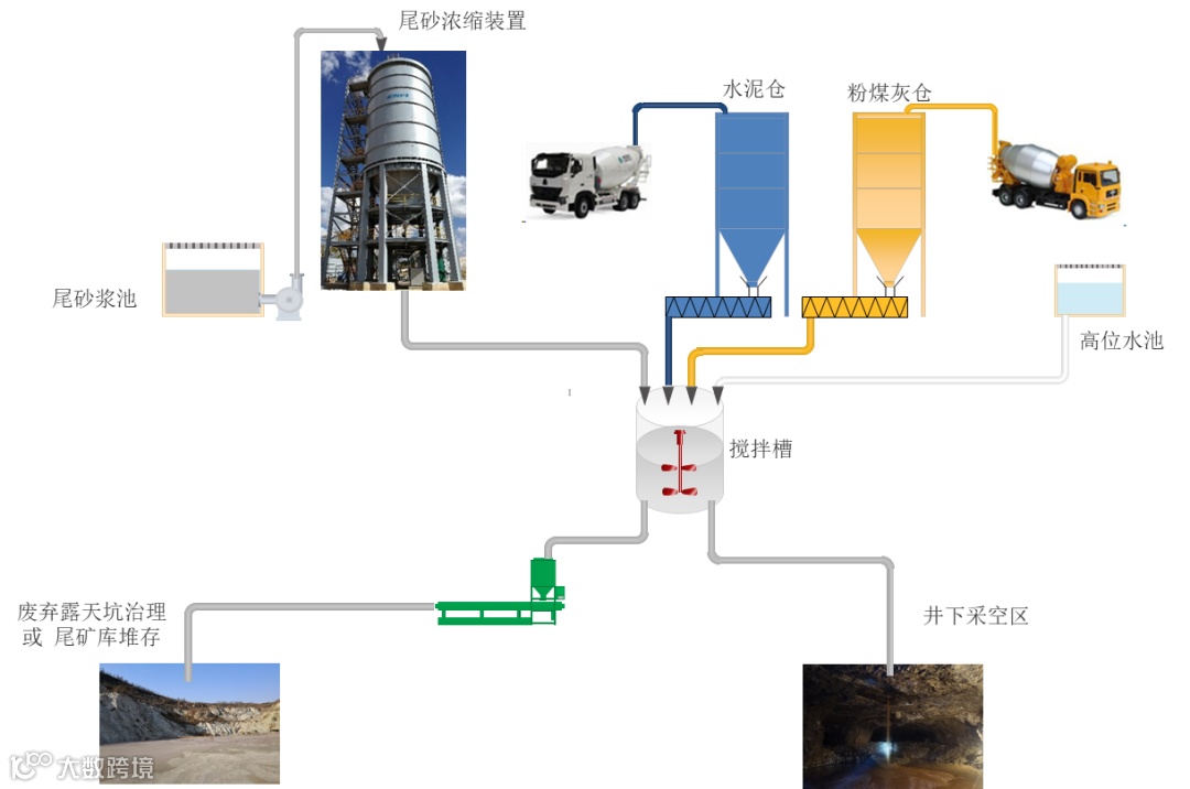 制备后的高浓度料浆或膏体从装置底部排出,根据配比要求添加水泥、粉煤灰、冶炼炉渣等,并搅拌混合均匀后,由充填泵加压经管道输送到井下采空区进行充填,或依靠重力自流输送到井下采空区充填。充填至井下采空区实现少脱水或不脱水,改善井下的作业环境。尾砂低成本处置达到提高采矿回收率和资源综合利用的目的。