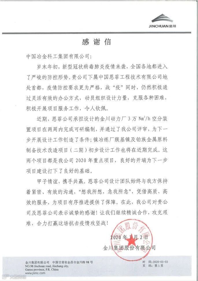 近日,中冶集团收到金川集团股份有限公司发来的感谢信,感谢中冶集团下属中国恩菲在新冠肺炎疫情期间,克服各种困难,“想客户之所想,急客户之所急”,通过灵活有效的办公方式,动员组织设计力量,高效率、高质量开展项目服务工作,为项目有序推进提供有力保障。