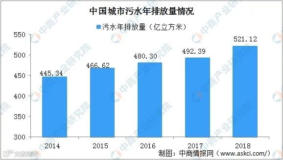 近几年,我国我国的污水排放总量持续增长。2014年中国城市污水年排放量445.34亿平方米,2018年增至521.12亿平方米。