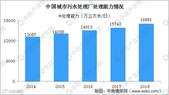 “十二五”以来,我国明确将节能环保产业作为战略新兴产业,政府密集出台各项环保政策(如“水十条”),我国污水处理规模已具备一定规模,水污染治理能力效果显着。我国污水处理能力不断增强。2014年我国污水处理厂处理能力13087万立方米/日,2018年处理能力提升至16881万立方米/日。