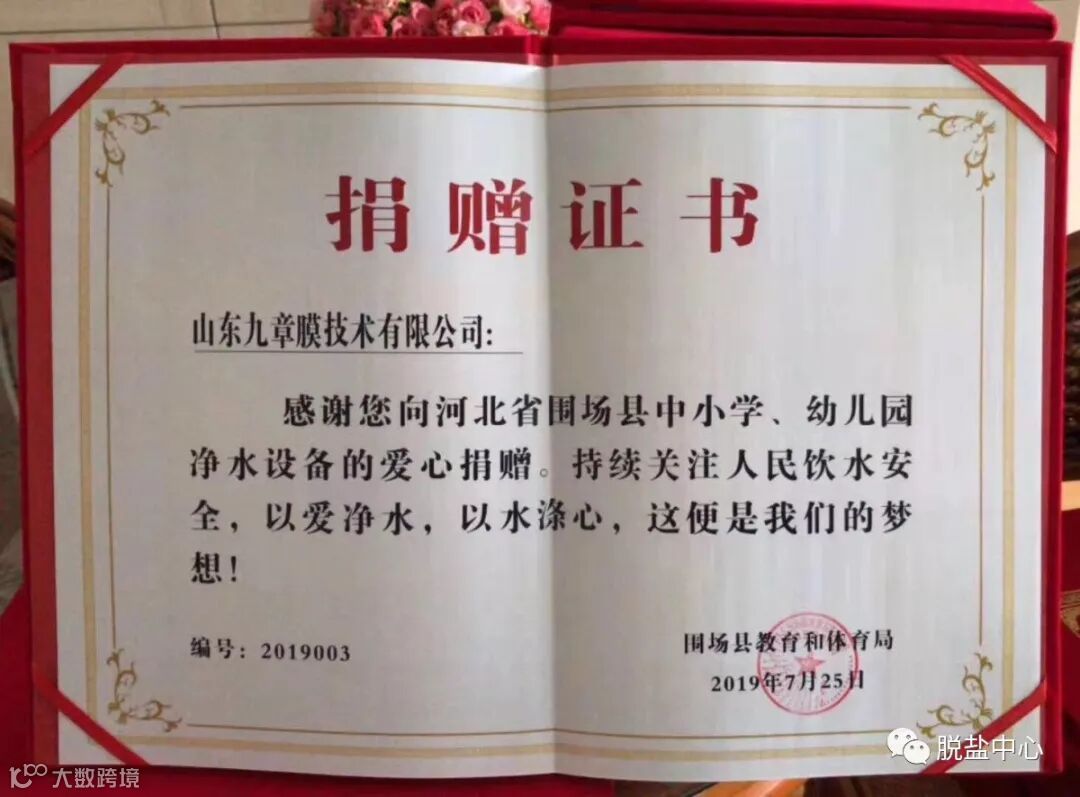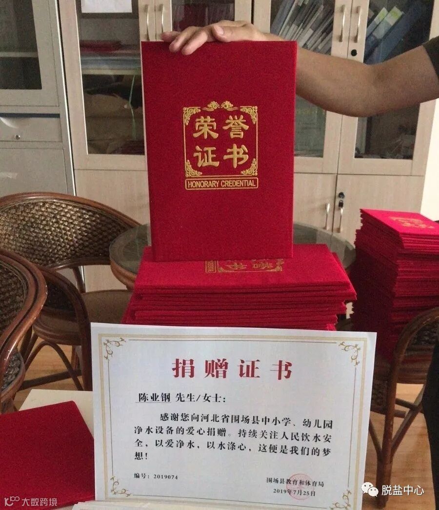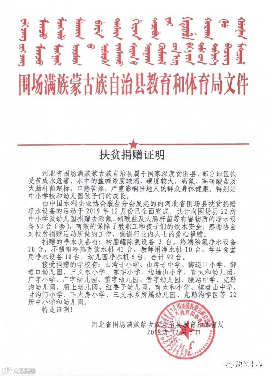 捐赠活动于2019年12月份已全面完成。据统计,此次共向围场县22所中小学及幼儿园捐赠去除氟、硝酸盐及大肠杆菌等有害物质的净水设备92台(套),分别是树脂罐除氟设备3台、终端除氟净水设备20台、不锈钢冷热直饮水机43台、教师用净水机10台、学生食堂用净水设备10台、幼儿园净水机6台,有效的保障了教职工和孩子们的饮水安全。