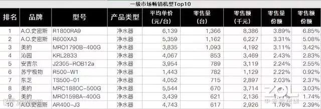 A.O.史密斯两款分列前两位,虽然单价价高,但尚属一线行业消费者接受范围之内。销售单价高的机型,也是销售额第一的机型,说实话很难让人想到。这也侧面说明了,一线城市消费者在净水器产品选购时,并不是将价格放在第一位的,更看重品牌的服务和产品的技术先进性。