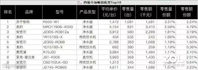 净水器品类中,少了5000元以上的产品,但均价仍不低。得出结论,不管是在何种地区,有意识去选择净水器产品的用户,对于价格的敏感度并没有我们想象的那么高,近几年净水器品牌对于市场的教育初见成效。除了净水器产品,三、四级市场中出现了较多的饮水机产品,除了净水器之外,他们也信赖饮水机,这与一级市场形成了反差。