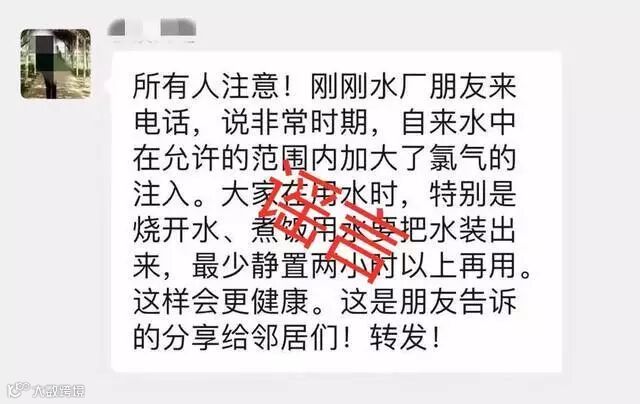 此前,就有这样一则传言:“某地自来水加大了氯气的注入,建议大家用水时至少静置两小时再使用。”为此,全国各地的供水企业纷纷“辟谣”。