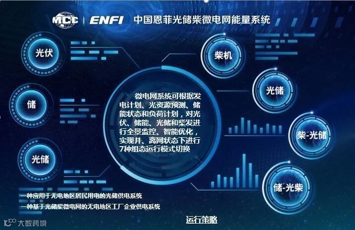 中国恩菲自主研发的光储柴微电网装置包括光伏组件、光伏逆变器、铅碳电池(选配)、铅酸电池(选配)、钒液流电池(选配)、锂电池(选配)、超级电容(选配)、储能双向变流器与后台智能监控等主要设备,具备数据采集、运行监控、能量管理等功能,在并网、离网情况下均可实现发电、储能与负荷的智能控制,保证供电系统的安全、稳定、经济优化运行。