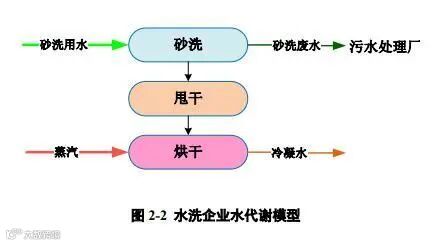 根据印染企业及水洗企业的工艺流程及进水排水特点,采用水代谢分析方法,分别构建出印染企业和水洗企业的水代谢模型,从而全面分析印染工业集聚区废水回用的途径,见图 2-1、图 2-2。