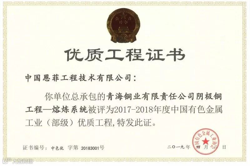 6月12日,2019年度有色金属工业建设工程质量监督工作会议在南京召开,中国有色金属工业协会副会长贾明星参会并为中国有色工业(部级)优质工程颁奖,中国恩菲总承包的青海铜业有限责任公司阴极铜工程-熔炼系统被评为“2017-2018年度中国有色金属工业(部级)优质工程”,这是公司首次以总承包商身份获此殊荣。