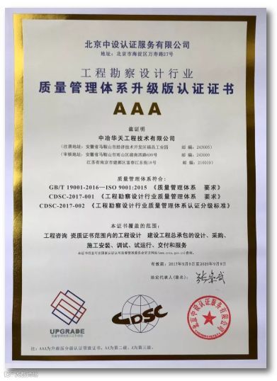 ◆ 工程勘察设计行业质量管理体系升级版顶级认证(AAA)证书