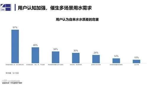 据中怡康用户调研数据显示,97%用户认为自来水水质差影响身体健康,46%用户认为自来水水质差会引发皮肤疾病。 这部分用户,对净水产品有极大的需求。