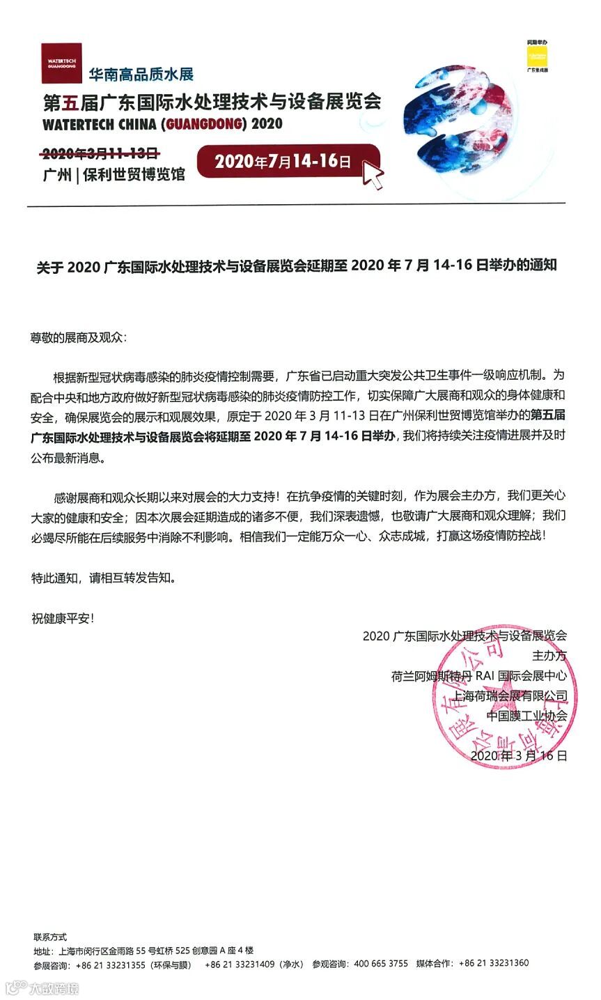 原定于2020年3月11-13日在广州保利世贸博览馆举办的2020广东国际水处理技术与设备展览会将延期至2020年7月14-16日举办。