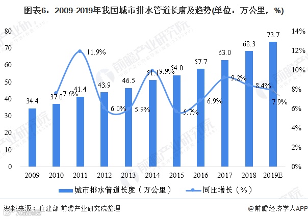 另一方面,近年来,城市排水管道长度加速增长。2018年,全国城市排水管道增加至68.3万公里,同比增速为8.4%,按照2009-2018年年均7.9%的复合增长率,预计2019年排水管道长度将突破70万公里。