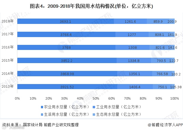 从需求结构看,农业用水一直是用水需求最大的产业,往往超过60%。其次是工业用水,需求占比约20%,第三用水需求是生活用水,最后生态用水。2018年,我国农业用水达3693.1亿立方米,占比61.39%;工业用水达1261.6亿立方米,占比20.97%;生活用水达859.9亿立方米,占比14.29%;生态用水达200.9亿立方米,占比为3.34%。从占比变化趋势看,生活用水和生态用水的需求占比逐渐增大,而工业用水的需求占比逐渐减少。