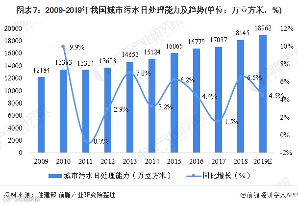 作为环保行业中的重要内容,污水处理行业在政府政策的支持下近几年发展态势较好,污水处理能力持续增强。国家统计局数据显示,2018年我国城市污水日处理能力已达1.81亿立方米,同比增长6.5%。按照2009-2018年年均4.5%的复合增长率,估计2019年我国城市污水日处理能力可达1.89亿立方米。