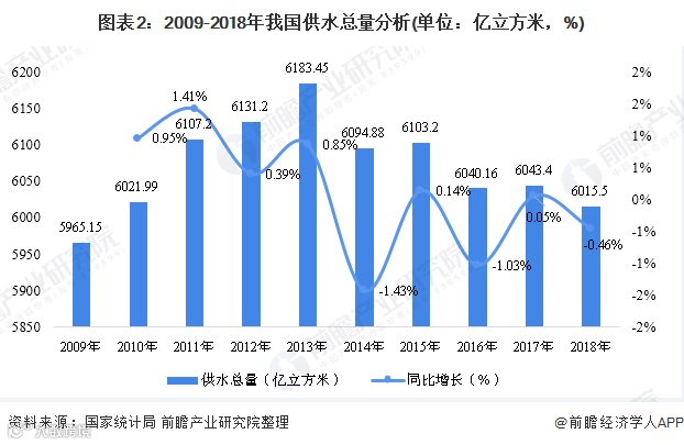 我国供水总量在2013年达到峰值,之后随着中央人民政府和各省严格水资源管理制度出台,供水总量增速开始缓慢下降。近几年,全国供水总量保持基本稳定,平均年变化幅度保持在±1%左右。2018年我国供水总量为6015.5亿立方米,同比减少0.46%,我国供水市场已趋近饱和,进入平稳发展状态,前瞻对现有市场的发展现状,估算2019年全国供水总量仍将保持6000亿立方米的水平线上。