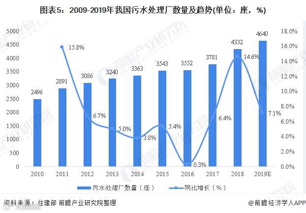 中国面临严重的水污染问题,污水治理也一直是水环境治理最重要的组成部分。从污水处理基础设施建设情况来看,一方面,污水处理厂数量逐年递增。2018年,全国污水处理厂增加至4332座,同比增长了14.6%,增速明显提高。按照2009-2018年年均7.1%的复合增长率,预计2019年污水处理厂将达4640座。