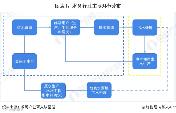 水务行业又可分为原水生产与供应、自来水生产和供应、污水收集、污水处理、中水与再生水利用等多个环节。一般意义上是指供水与排水。除了传统的供水和排水管理,水务产业还包括保护和扩大水资源、节水减排、中水回用、淡化海水、用水需求管理、社区性计划、集水区管理以及举办公共教育及增强节水意识活动等事务