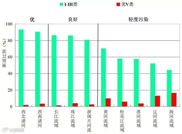 2019年1-6月,长江、黄河、珠江、松花江、淮河、海河、辽河等七大流域及西北诸河、西南诸河和浙闽片河流Ⅰ-Ⅲ类水质断面比例为77.9%,同比上升4.6个百分点;劣Ⅴ类为4.5%,同比下降2.7个百分点。主要污染指标为化学需氧量、氨氮和五日生化需氧量。其中,西北诸河、浙闽片河流、西南诸河和长江流域水质为优,珠江流域水质良好,黄河、松花江、淮河、辽河和海河流域为轻度污染。