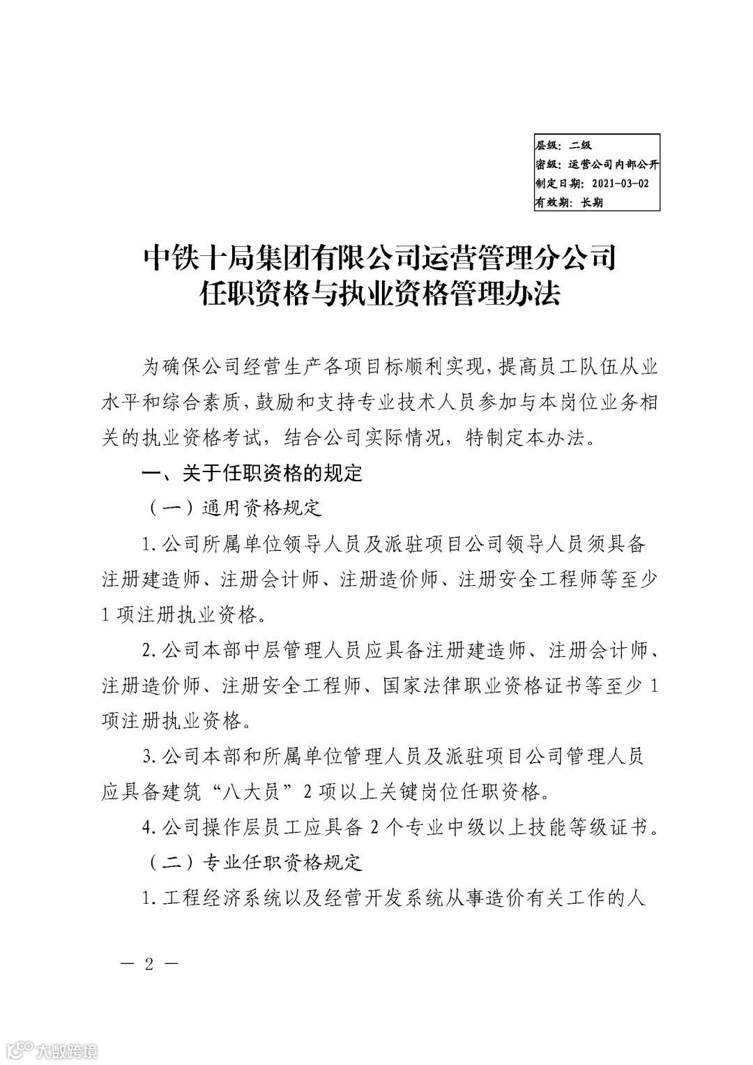 运营公司为提高员工队伍从业水平和综合素质,结合实际情况,制定了任职资格与执业资格管理办法,明确了各个层级和业务系统员工的通用资格、专业任职资格条件,规定公司所属单位领导人员、派驻项目公司领导人员和本部中层管理人员至少具备1项注册执业资格证书,一般管理人员应具备建筑“八大员”2 项以上关键岗位任职资格,各业务系统人员需具备相关职业资格证书。
