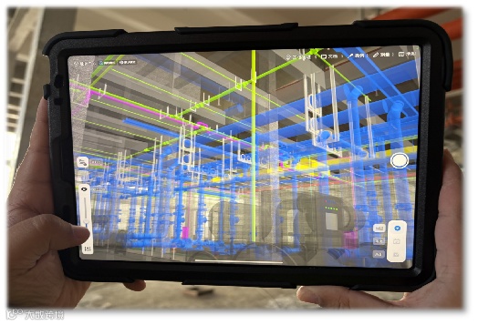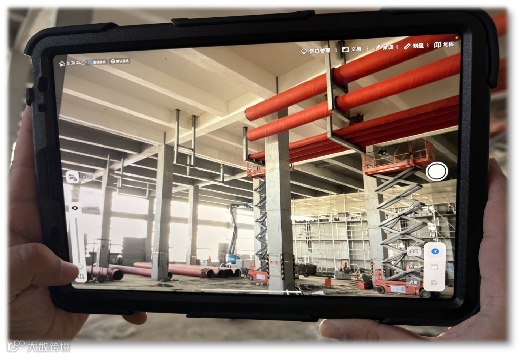 本工程机电系统复杂,管线高度集中,项目部将AR与BIM技术相结合,利用移动端以二维码作为模型坐标点,将项目BIM模型1:1投射进施工现场,通过AR便可看到实景与设计的无缝融合,实现“机电管线透明化”,帮助项目在管线放样、设备安装、管线接驳等阶段性工序可实时与BIM建模进行比对,确保了实体工程质量可控。
