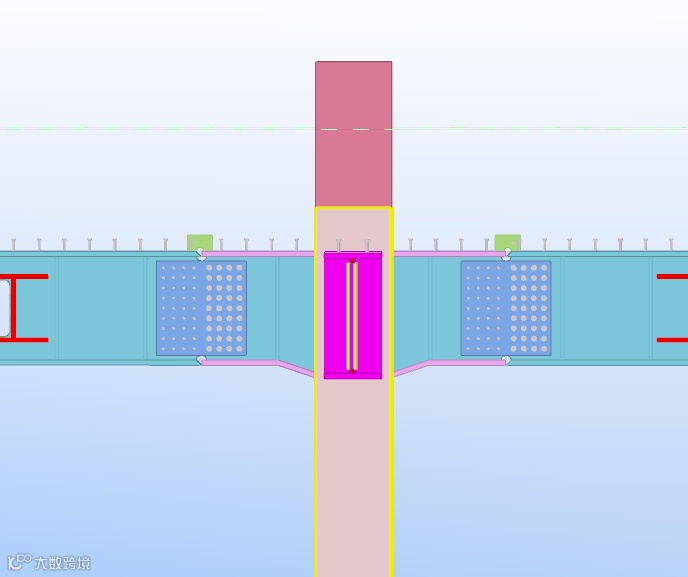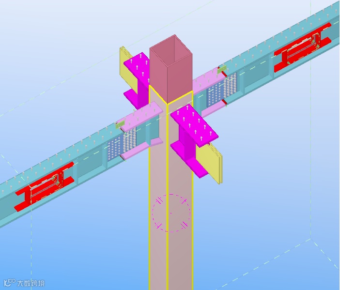 本工程上部为全钢结构,钢结构工程总用钢量约3900吨,节点多、体量大,导致工期较为紧张。项目部积极优化钢结构连接节点,并将部分需后期焊接的幕墙埋件优化为工厂钢构件一体成型,为后续施工提升了效率,保证了工程品质;利用BIM模拟工况,细化吊装方案,配备两台T7527塔吊,仅用2个月顺利实现了结构封顶。此外,项目部与设计沟通后,将部分区域钢梁防火涂料由非膨胀型防火涂料改为耐候性能好、自重低的膨胀型防火涂料,提升工效的同时大大增加了观感。