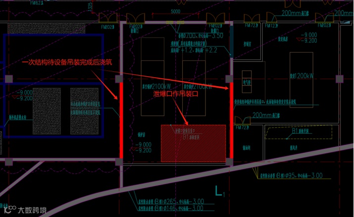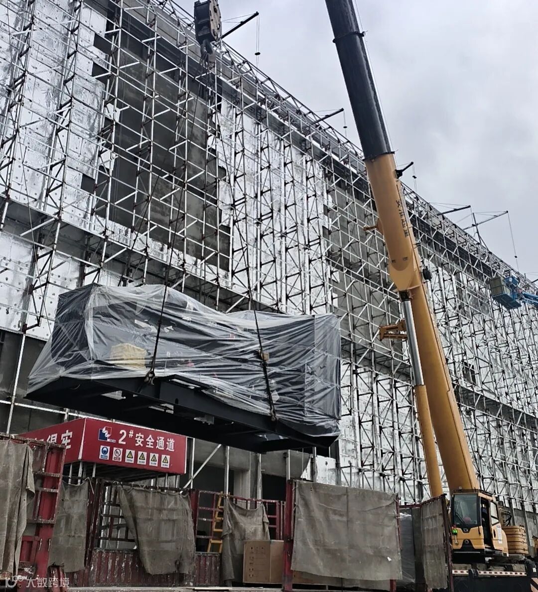 该工程冷机、锅炉及柴发机组等核心设备体积大、质量重,为确保这些设备的安全高效吊装就位,项目部经多方案比选,将锅炉房泄爆口确定为重型设备的专用吊装口,待设备吊装完成后再封闭泄爆口两侧的一次结构。项目部精准核算设备载荷分布,选用适配的吊装机械;对泄爆口周边结构进行临时加固,确保结构安全;优化施工顺序,提前预留设备运输通道,避免二次搬运,最终实现所有重型设备平稳高效就位。