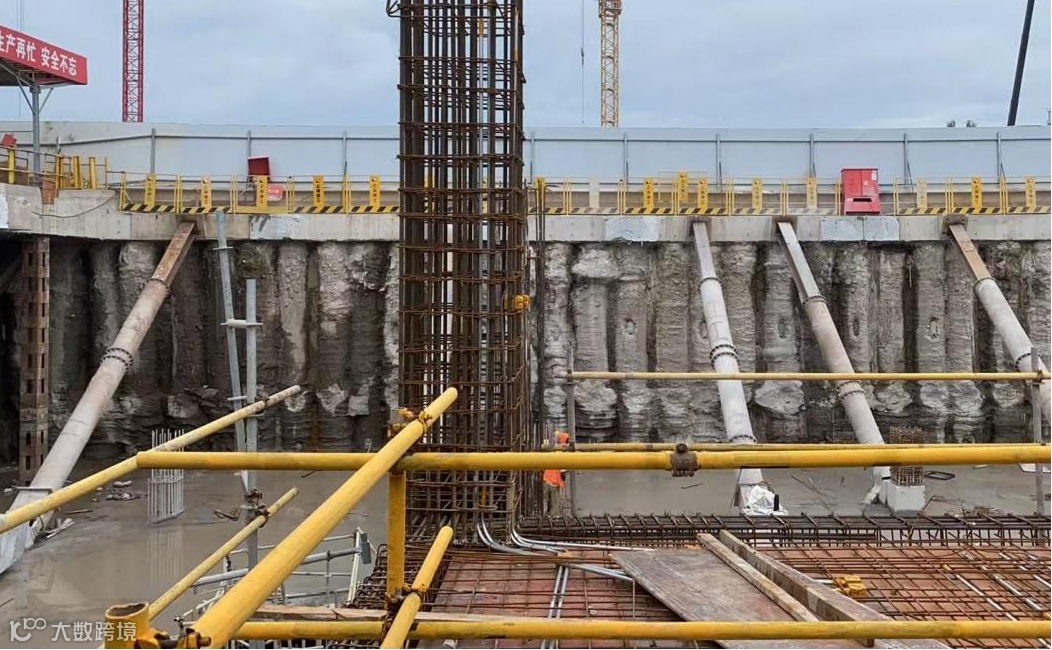本工程基坑开挖面积约28390平方米,开挖深度约13.75米,总土方量约41.5万立方米。基坑土方采用分层分段开挖,首层由南向北退挖,二至三层采用盆式开挖,共分19块,底层则采用跳仓法开挖。由于该地块仅有西侧泰陇路可作为施工道路,且与北侧二期地块共用,车辆通行条件差。项目部利用部分二期场地进行蓄车,并配备专人指挥车辆通行,保证出土流畅。因北侧二期地块工况调整,二期首道支撑水平力需传递至本项目斜抛撑,为避免因此导致北侧基坑围护变形过大,项目部与设计沟通后于基坑北侧梁柱交点处增加斜抛撑11根,有效减小了基坑变形。