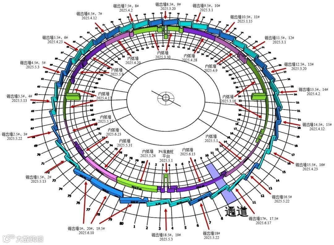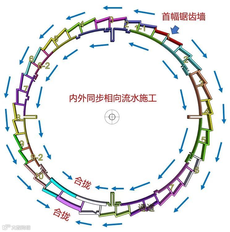 在储存环的长期服役过程中,为确保产生的电子辐射不逸散至外部,起到辐射屏蔽功能,隧道结构不允许出现任何贯穿裂缝。为实现结构“无裂缝”的控制要求,项目部结合储存环隧道内外墙体形体特征,将内外墙体分成57个施工段,采取“内外反向递推、相向合拢”流水施工步序。