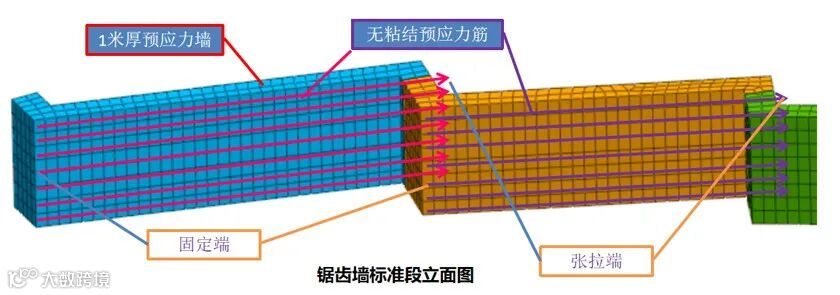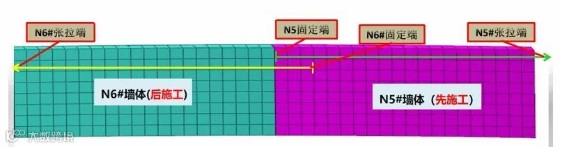 同时,项目部采用后张法预应力施工,利用无粘结预应力钢筋提供的压应力平衡混凝土收缩产生的拉应力,并根据混凝土测温曲线及混凝土强度形成规律,进行两阶段预应力张拉施工;并充分考虑混凝土收缩及两阶段预应力张拉对超厚墙体变形稳定期的影响,严格执行相邻墙体之间施工间隔≥14天的管控措施,在有效控制混凝土裂缝产生的同时,实现了全环内外墙体不设任何后浇带的目标。