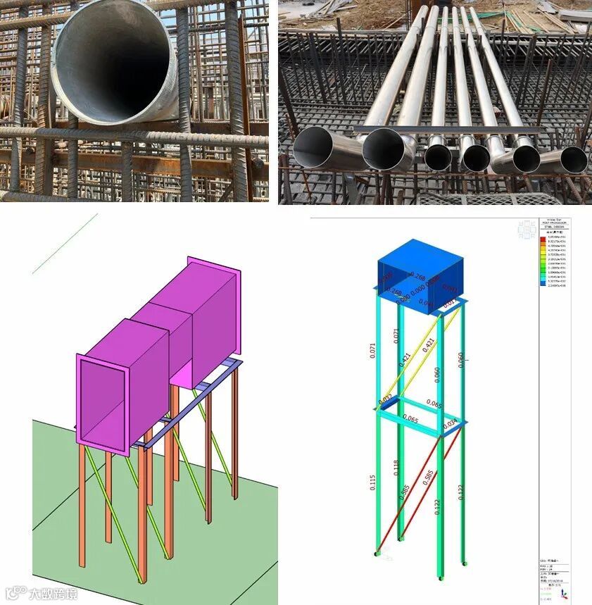 根据预留预埋套管的不同类型样式、安装高度,项目部对每一种套管都单独设计了型钢支架,全面考虑了混凝土浇捣前后的荷载及变形情况,采用预抬标高等措施,确保所有预留套管的最大绝对变形均≤5毫米。