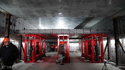 在前期直线加速、输运线隧道的施工过程中,项目部针对其特有的双套夹层结构特点,自主研发了模块化行走式顶升平台装备,提出了先梁板、后柱墙的逆作施工工艺,共投入6台装备,历时80天,顺利完成了27次顶升作业,对比传统工艺节约工期约50天。该技术为国内外首次提出,可推广应用至类似直线隧道的夹层结构施工,也为后续储存环隧道的顺利封闭提供了时间保障。