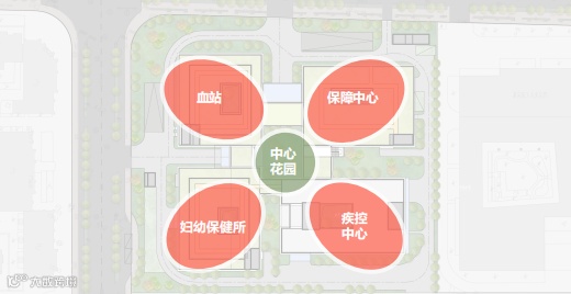 项目秉承“绿色优先、城市优先、功能优先、环境优先”的原则,采用“一芯四瓣、飞檐凌宇”的合院式建筑布局手法,将宜人的景观环境、舒适的建筑尺度、具标志性的建筑形象与嘉定新城核心区整体风貌融为一体。整个建筑中疾控中心、妇保院、血站业务空间独立成区,便于人员就医,同时又将培训、宣传、后勤等保障功能集中于保障中心共享。