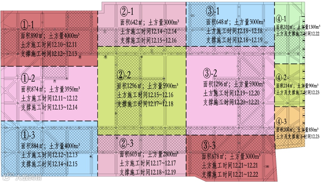 随着土方卸点的逐步恢复,项目部对单层土方进行精细化分区,同时对混凝土伺服系统进行精细化分级加载策划,确保最大程度加快基坑施工速度。最终,成功在30天内完成了两层土方及一道支撑的施工,累计出土9万余方,为2025年春节前完成B区底板争取到了宝贵的时间。