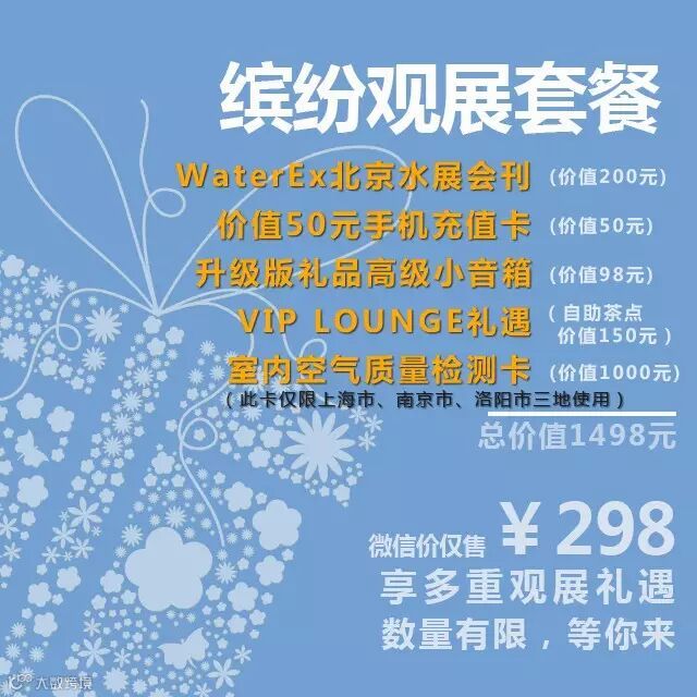 缤纷观展套餐内含总价值1490元的多项产品和服务礼遇。北京水展会刊低价购、VIP贵宾休闲区商务休闲两不误、还有手机充值卡及超低价室内空气质量检测卡,都在微信里哦!