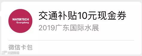 凡于开展之前,在“WATERTECH 广东水展”公众号领取过交通补贴的观众,凭微信卡劵,即可领取十元交通补贴现金。 |
