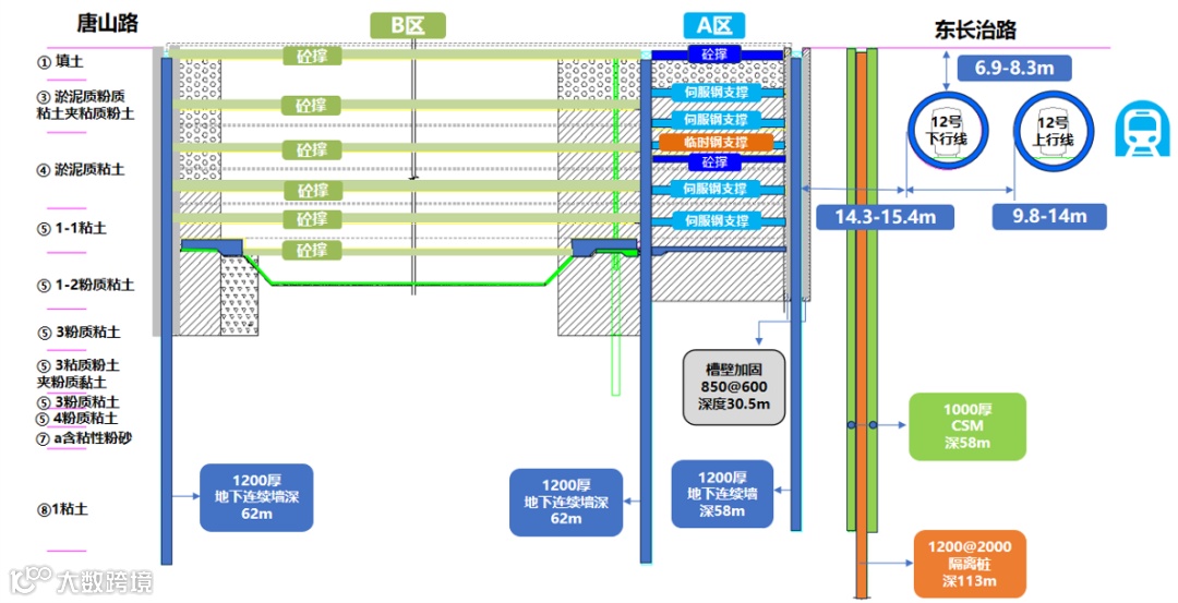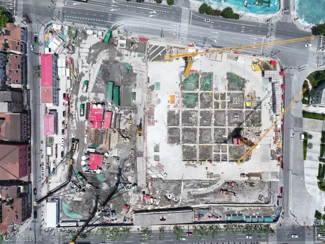 本项目占地面积2.18万平方米,基坑分为A、B、C、D四个区,此次完成首道支撑的B区(塔楼区)基坑面积为9469平方米,基坑普遍挖深24.4米,塔楼下挖深28.5米。本项目支护体系为“地下连续墙+六道钢筋混凝土支撑”的形式,其中第六道撑内埋于大底板中。