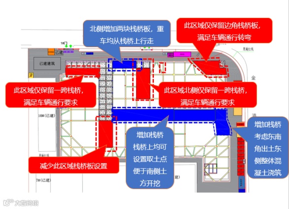 项目部在保证基坑安全及栈桥板施工作业量不变的前提下,对原有栈桥板进行优化布置。即在项目西北侧栈桥处减少一跨布置,仅需满足车辆通行要求;西南角栈桥减少四跨布置;东北角栈桥仅保留一小部分,满足车辆通行及转弯;中间栈桥减少5跨,仅保留一跨用于连接2#门,重车均从栈桥上行驶。同时,增加东西向栈桥,整个场地形成环形通路,车辆无需掉头,大大减少了道路行车方案对围护产生的变形影响,降低了基坑围护发生变形的可能,同时解决了土方开挖及外运过程中因施工场地狭小导致进度缓慢的问题,进而保证了施工节点目标。