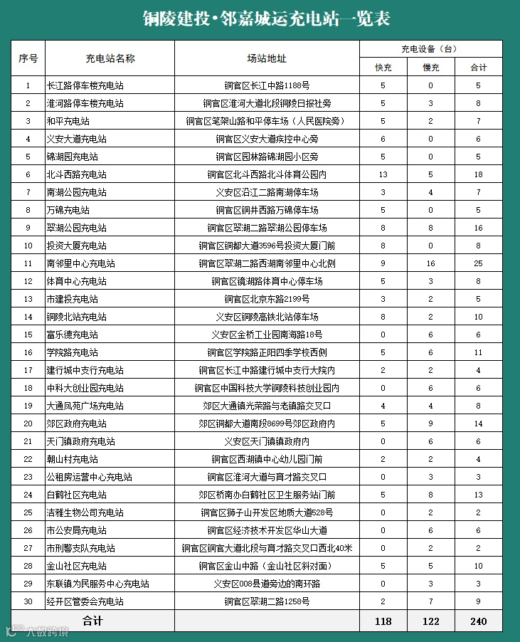 充电站点30个、充电桩240台