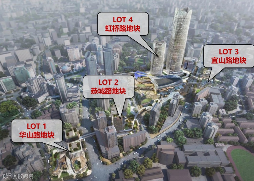 徐家汇中心ITC项目,整体由华山路地块、恭城路地块、宜山路地块、虹桥路地块4个部分组成。其中,主地块虹桥路地块总建筑面积超70万平方米,由2栋超高层主楼A座办公楼(220米)和B座办公楼(370米),15层酒店、7层裙房以及6层地下室构成。