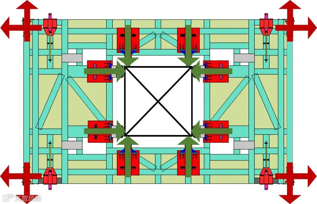 内锁外撑平面紧固系统通过液压夹紧油缸与核心筒形成主动型可靠连接;借助楔轮一体的转动支架等,可锁紧塔吊标准节,实现塔吊水平方向的限位。