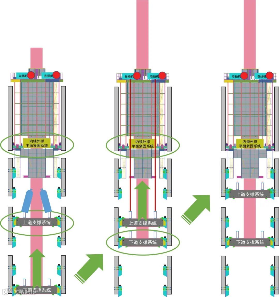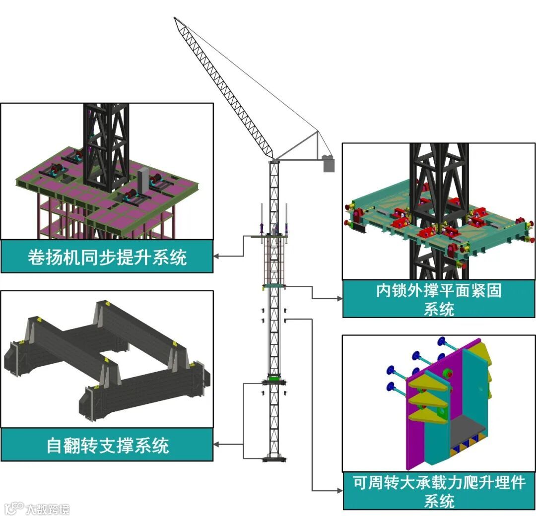 主要协同装备有:动臂内爬塔吊、单元式钢平台、集成于单元式钢平台顶梁的卷扬机同步提升系统、集成于单元式钢平台底梁的内锁外撑平面紧固系统、可周转大承载力爬升埋件系统、双道自翻转支撑系统等。