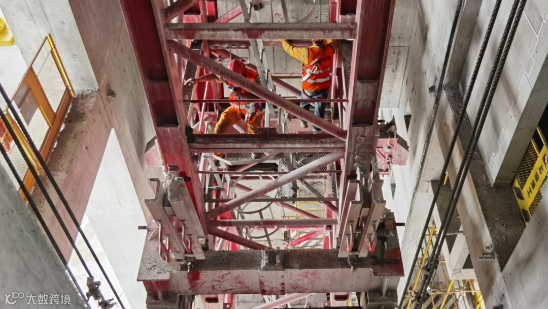 以单元式钢平台为基础的动臂内爬塔吊阶梯式爬升模式有效解决了传统工艺中,塔吊爬升时需要外塔协助从下往上翻转支撑钢梁所存在的“吊点单一缺乏容错、穿越脚手容易坠落、钢梁晃动存在危险”等安全问题。