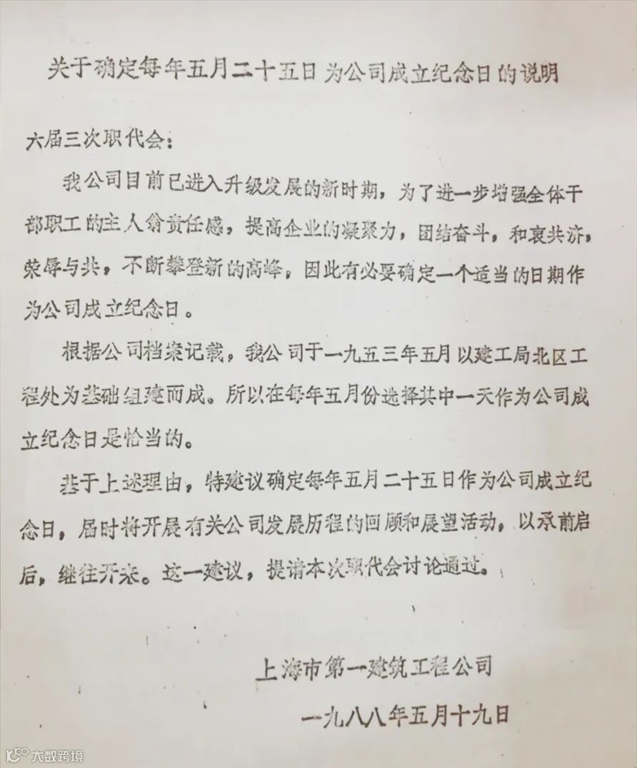 【延伸:1988年5月19日,上海市第一建筑工程公司第六届职工代表大会第三次会议确定5月25日为公司成立纪念日。】