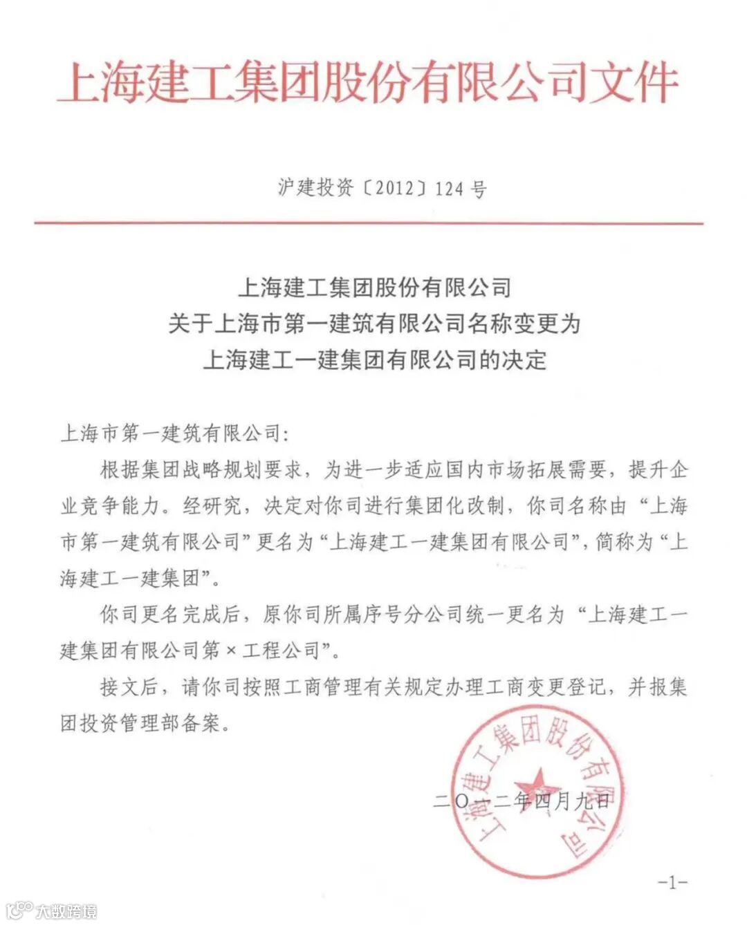 2012年5月,上海市第一建筑有限公司进行集团化改制,更名为上海建工一建集团有限公司。