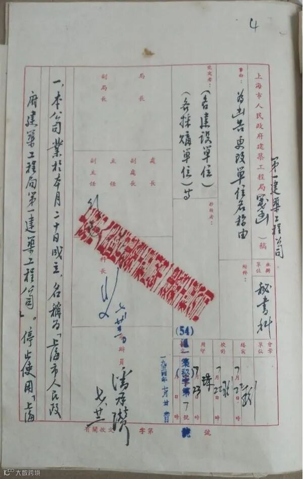 1954年7月,上海市人民政府建筑工程局建筑工程公司北区工程处更名为上海市人民政府建筑工程局第一建筑工程公司。