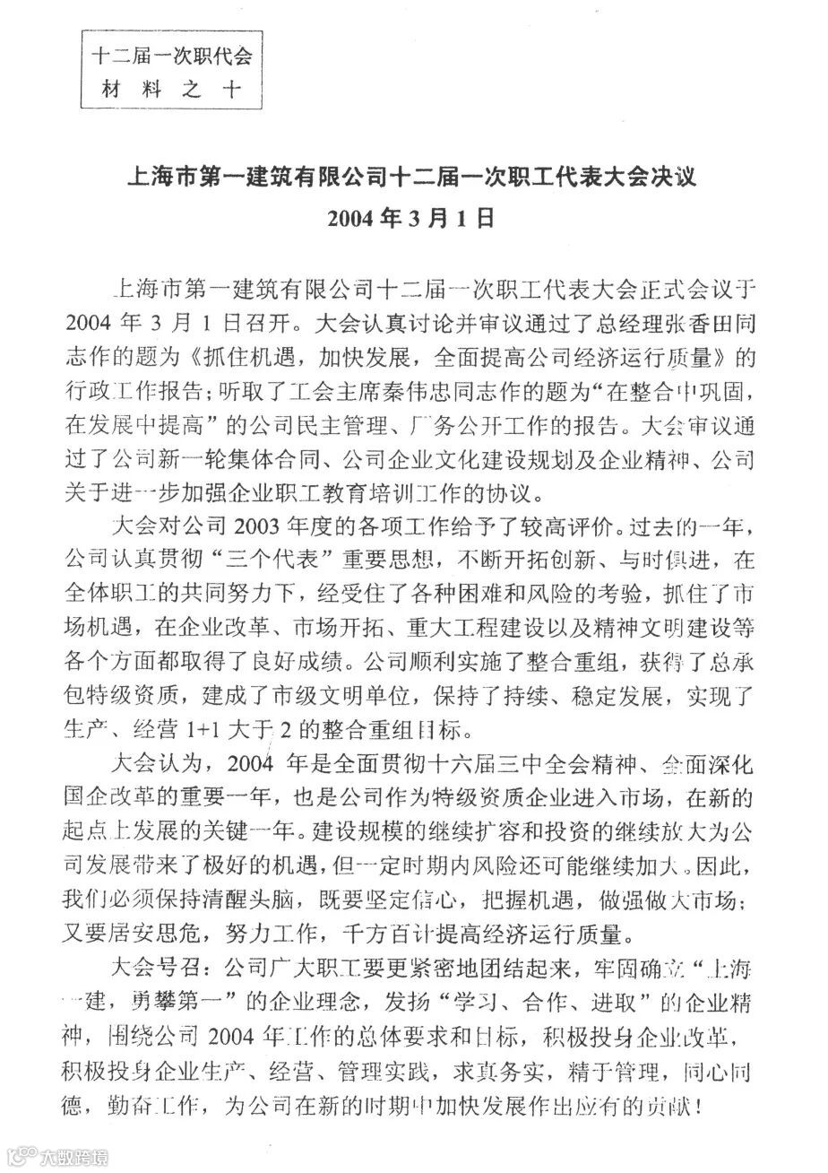 2004年3月1日,上海市第一建筑有限公司第十二届职工代表大会第一次会议,审议通过“上海一建、勇攀第一”为企业核心价值观。