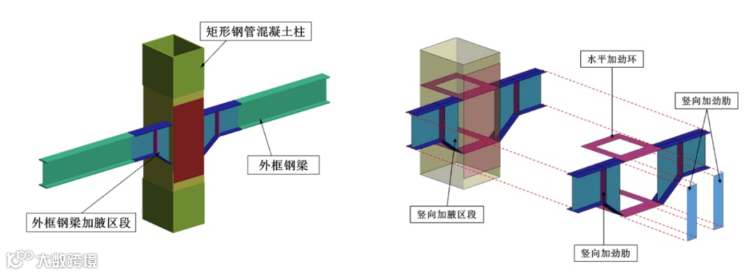 “无柱”空间是设计师赋予苏河湾中心的核心设计理念,同时也是这栋办公楼最大特色之一。为了实现“无柱”空间这一设计理念,设计师将外框架柱推至外框梁的外侧,形成了有别于常规做法的“偏心”的梁柱节点。
