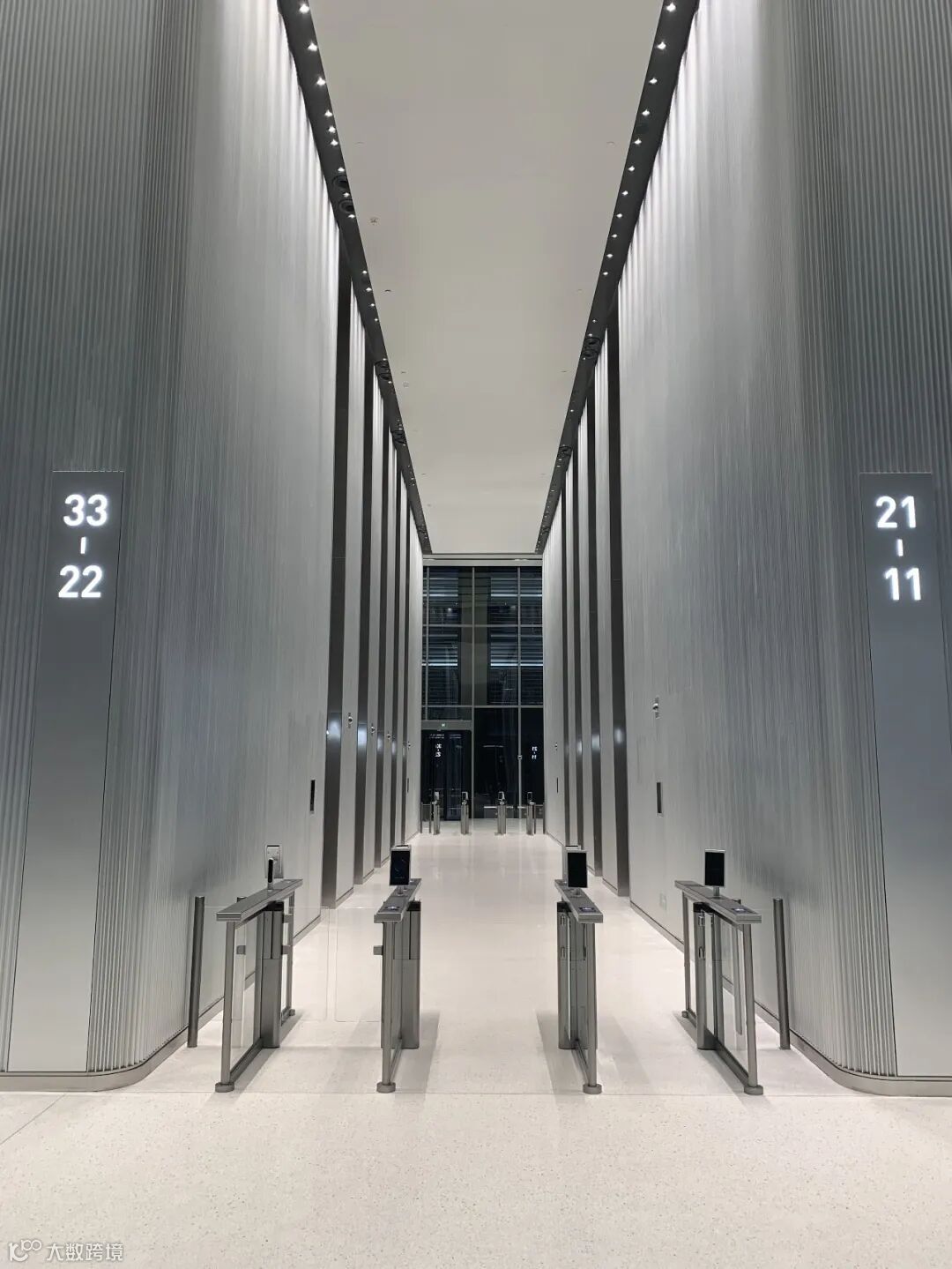 设计师想要在苏河湾中心上呈现最大化视觉体验的建筑语言,因而提出了“无界”办公这个概念。“无柱”空间是“无界”办公的前提,但仅凭“无柱”空间是无法达到“无界”办公的。只有注重每一个细节,使得建筑内部空间变得“通透”,才能够使达到“无界”办公。