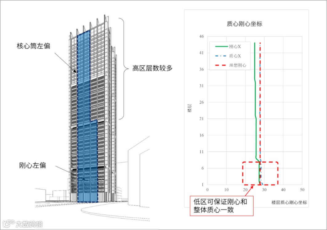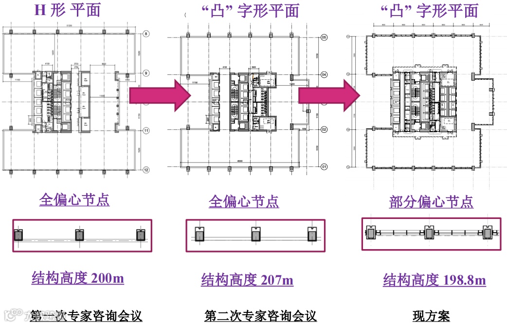 在200米主塔楼的设计上,设计师通过“凸”型体型设计从视觉上表达出双子塔那般独特的效果,其独特的造型象征着苏州河沿岸曾经由工业区和钢铁桥所塑造的视觉特质,也对结构平面布置提出了巨大的挑战。
